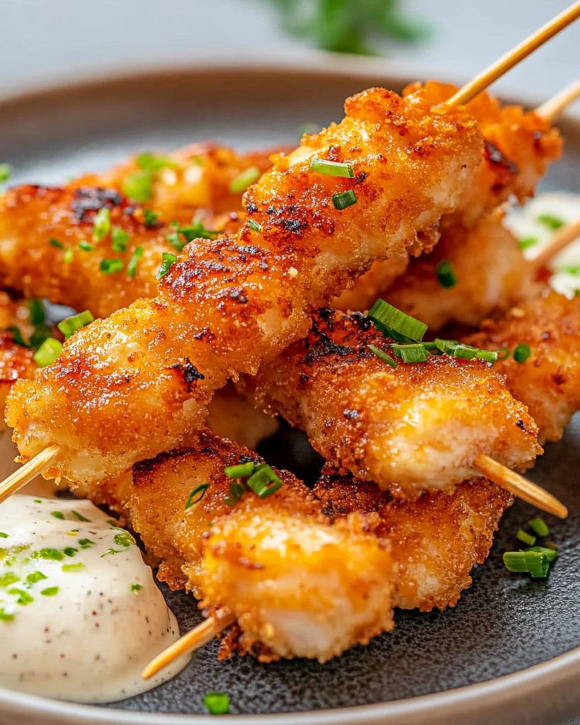There’s something irresistibly fun and nostalgic about food on a stick, don’t you think? These golden, crispy chicken skewers are the perfect bite-sized indulgence—perfect for dipping, sharing, or simply savoring one delicious skewer after another.